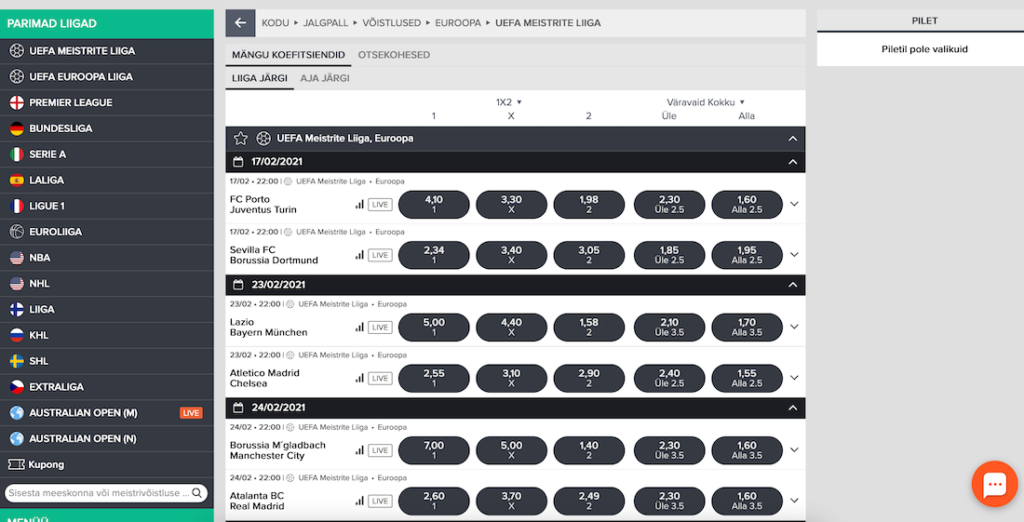 Spordialad ja liigad leiad traditsiooniliselt vasakul menüüs, kuid eraldi on välja toodud “Parimad liigad” kategooria, mis aitab kiirelt ja mugavalt minna hetke kõige populaarsemate sündmuste lehele.